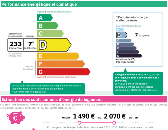 DPE (D) et GES (B) Estimations des coûts annuels d’énergie du logement : entre 1 490 € et 2 070 € par an (prix moyens des énergies indexés sur les années 2021 2022 2023 abonnements compris).