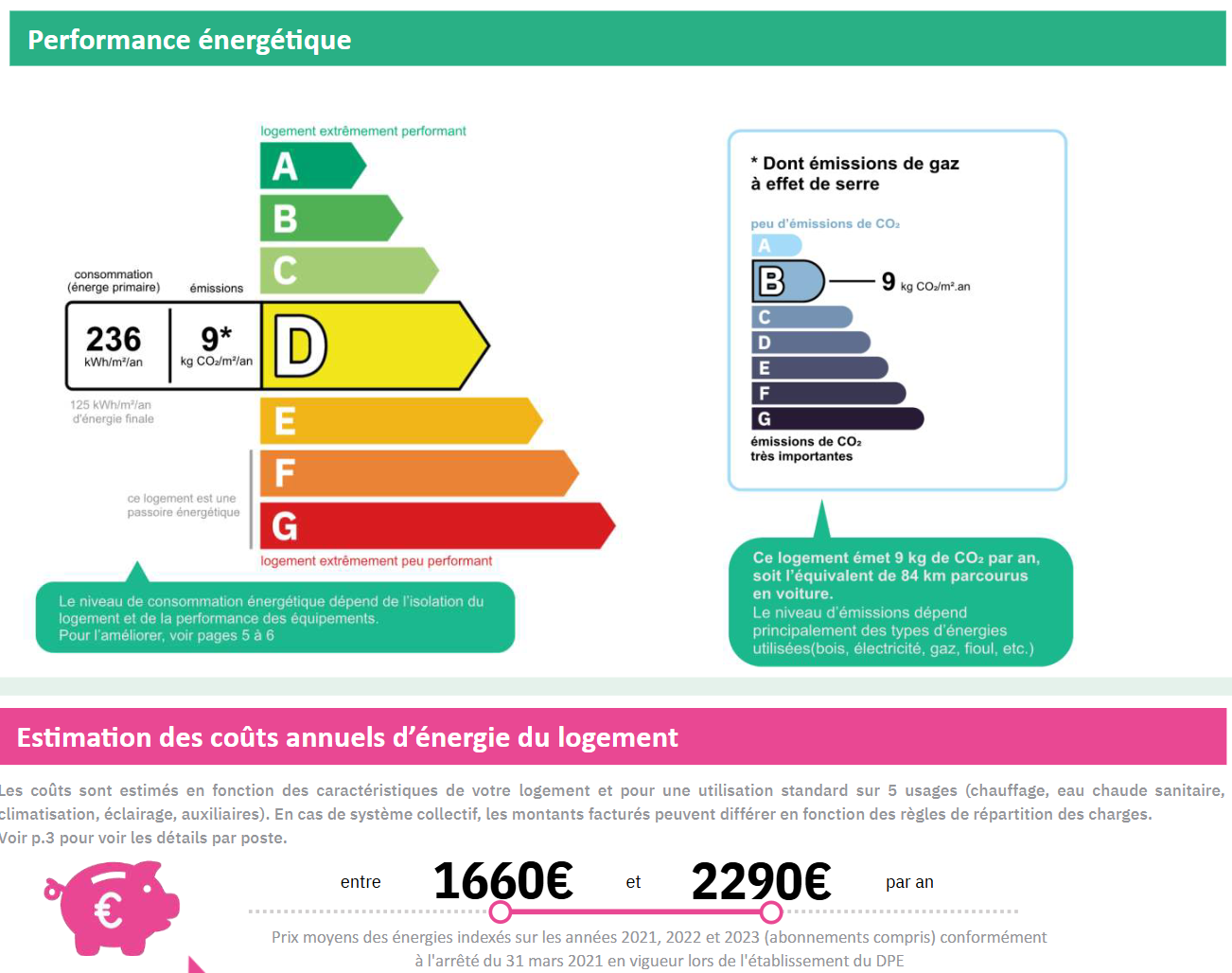 DPE (D) et GES (B) Estimations des coûts annuels d’énergie du logement : entre 1 660 € et 2 290 € par an (prix moyens des énergies indexés sur les années 2021 2022 2023 abonnements compris).