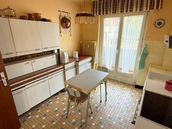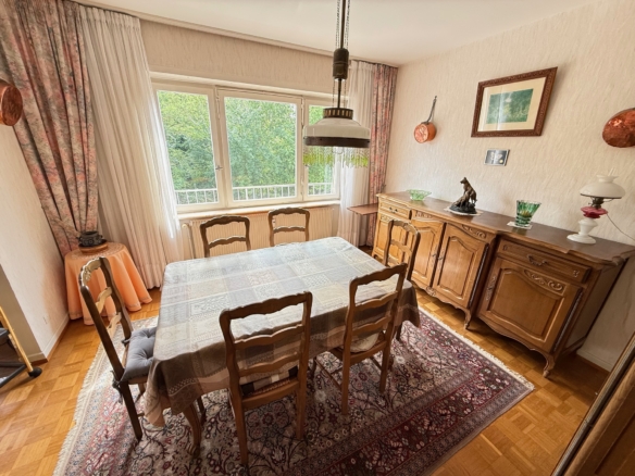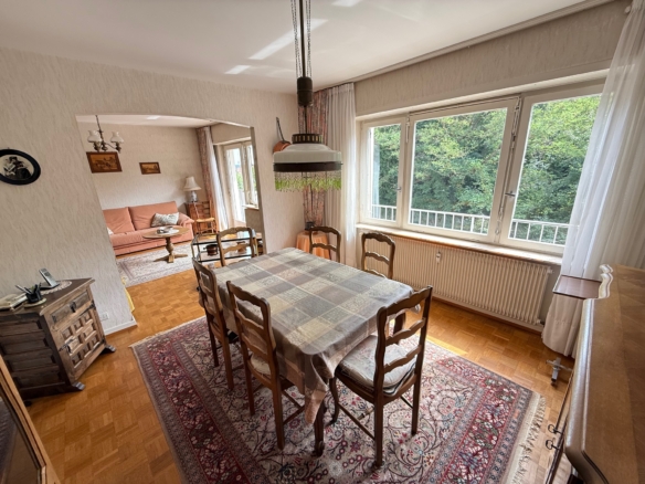 L’appartement se situe au rez-de-chaussée surélevé d’une copropriété bien entretenue. Il offre une surface habitable de 94,49 m², comprenant une entrée, une cuisine indépendante avec coin repas, un salon, une salle à manger (pouvant faire office de troisième chambre), deux chambres, une salle de bains avec baignoire et des toilettes séparées. Deux balcons permettent de profiter d’un extérieur agréable.