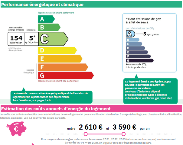 DPE 154 (C) et GES 5 (A) Estimations des coûts annuels d’énergie du logement : entre 2 610 € et 3 590 € par an (prix moyens des énergies indexés sur les années 2021, 2022, 2023 (abonnements compris).