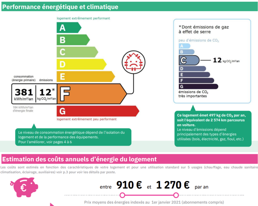DPE établi le 24/01/2023 DPE 381 (F) et GES 12 (C) Estimations des coûts annuels d’énergie du logement : entre 910 € et 1270 € par an (prix moyens des énergies indexés au 1er janvier 2021 abonnements compris). Logement à consommation énergétique excessive.