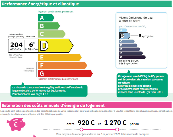 DPE établi le 12/05/2023 DPE 204 (D) et GES 6 (B) Estimations des coûts annuels d’énergie du logement : entre 920 € et 1270 € par an (prix moyens des énergies indexés au 1er janvier 2021 abonnements compris).