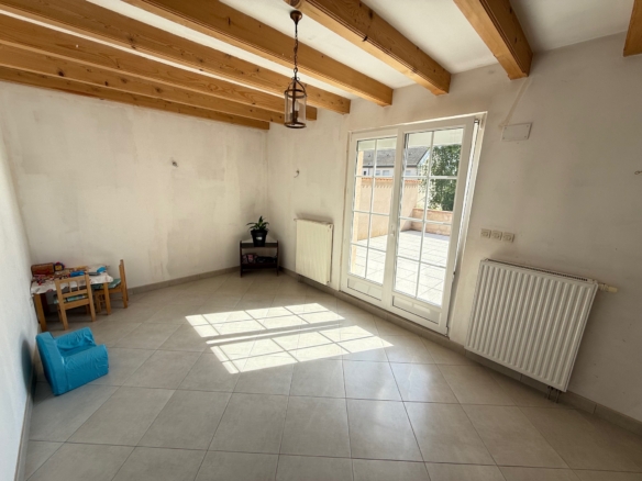 La maison s’organise sur trois niveaux et dévoile tout son potentiel dès l’entrée. Le rez-de-chaussée accueille une entrée spacieuse, un salon baigné de lumière, une cuisine conviviale avec coin repas, un WC suspendu séparé ainsi qu’un séjour à terminer selon vos envies.