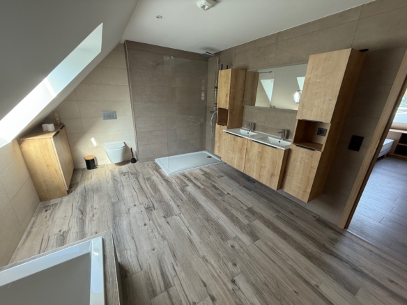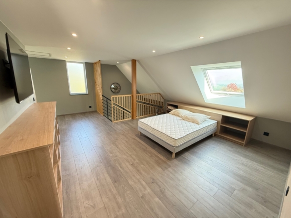 À l’étage, l’espace nuit propose trois belles chambres aux volumes généreux dont une possédant un dressing digne d’une reine de shopping ! Une mezzanine pouvant servir d’espace bureau, de chambre ou de détente, ainsi qu’une salle de bains élégante.