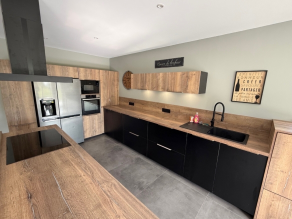 En complément, la maison dispose d’une cave, d’une buanderie et d’un grand garage double équipé d’une porte sectionnelle motorisée.