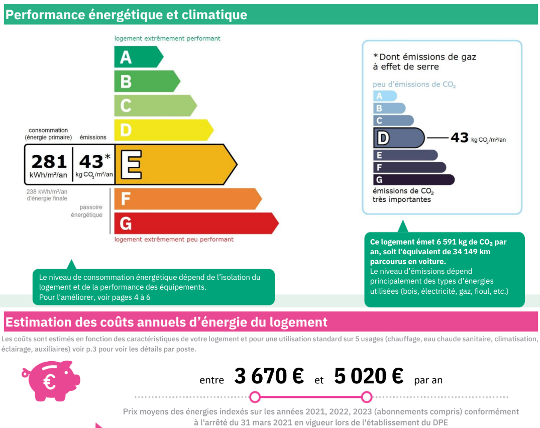 DPE 281 (E) et GES 43 (D) Estimations des coûts annuels d’énergie du logement : entre 3 670 € et 5 020 € par an (prix moyens des énergies indexés sur les années 2021, 2022, 2023 (abonnements compris).