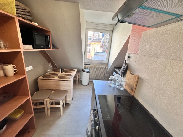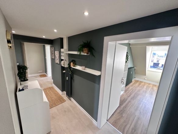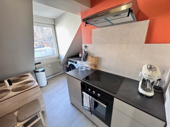 STRASBOURG, Neustadt, 23 rue du Maréchal Joffre, chambre individuelle dans bel appartement F4 duplex de 80,47m² habitables et 120m² au sol, entièrement rénové avec goût ! Situé au 5ème et 6ème étage sans ascenseur, cet appartement aux belles prestations est parfait pour accueillir 4 étudiants en colocation. Il est composé d’une entrée couloir, de 4 chambres à coucher chacune équipée d’un point d’eau et d’une serrure individuelle, d’une cuisine équipée séparée, d’une salle d’eau (douche à l’italienne), et d’un wc séparé. En complément, une cave au sous-sol. L’immeuble dispose également d’un local vélo au sous-sol. Le chauffage est au gaz collectif avec répartiteur de calories (comptage individuel), l’eau chaude se fait au moyen d’un ballon électrique. L’ensemble des charges est compris dans un forfait mensuel de charges.